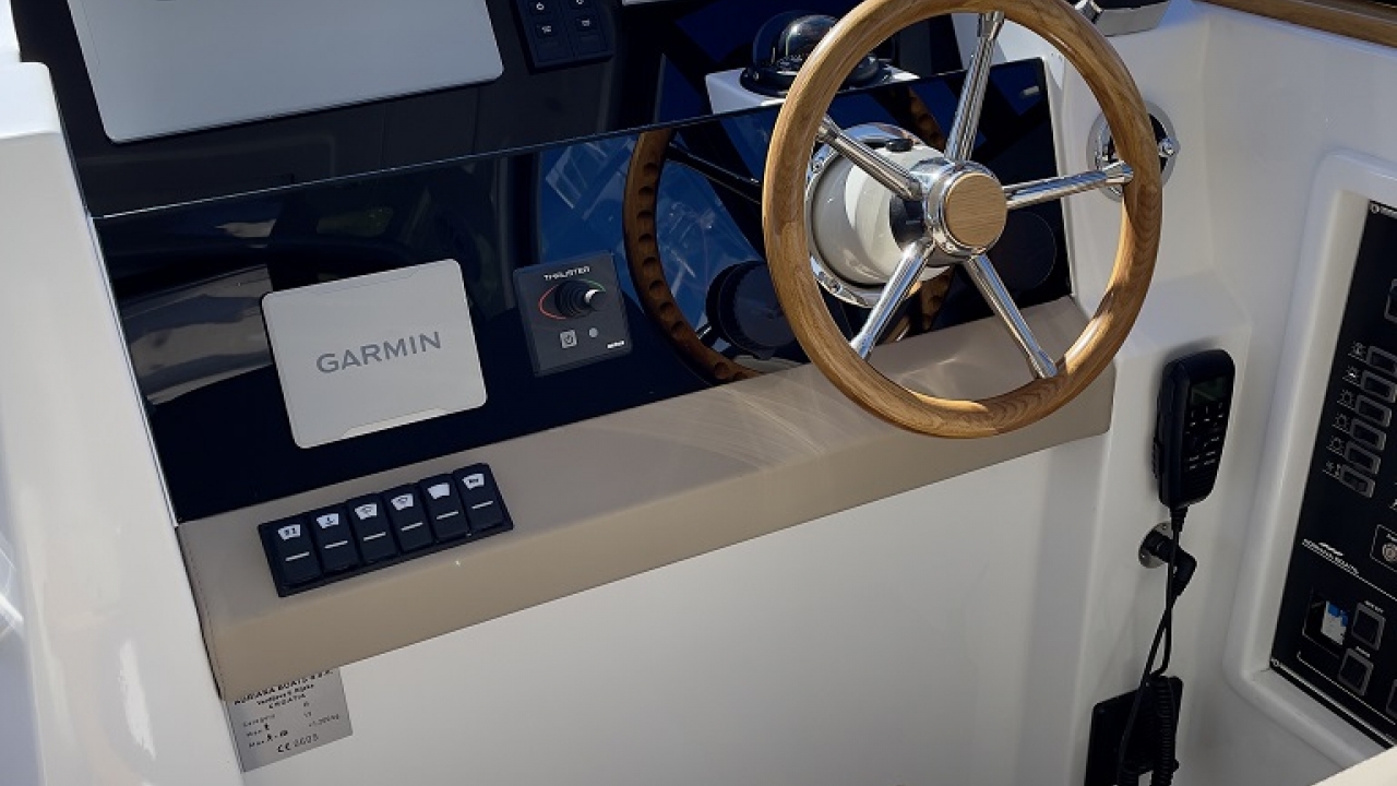 Autopilot, compass, VHF radio, GPS plotter, sea charts, harbor handbooks, navigation tools, binoculars