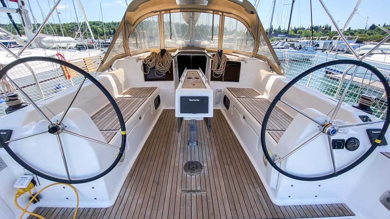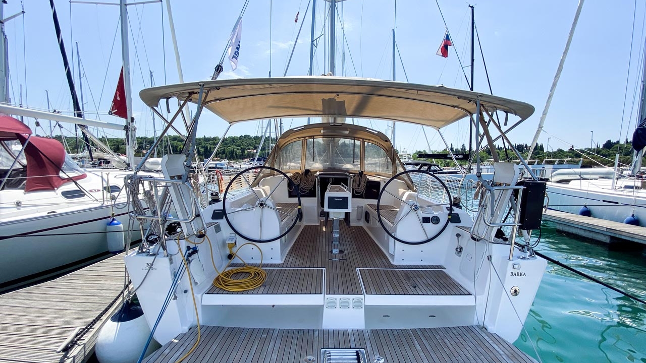 The Dufour 382 GL „Barka“ is equipped with a classic/standard mainsail and a furling/roll genoa as well as a Bimini top, Autopilot, Sprayhood, Heating, Teak cockpit, GPS chart plotter - cockpit.