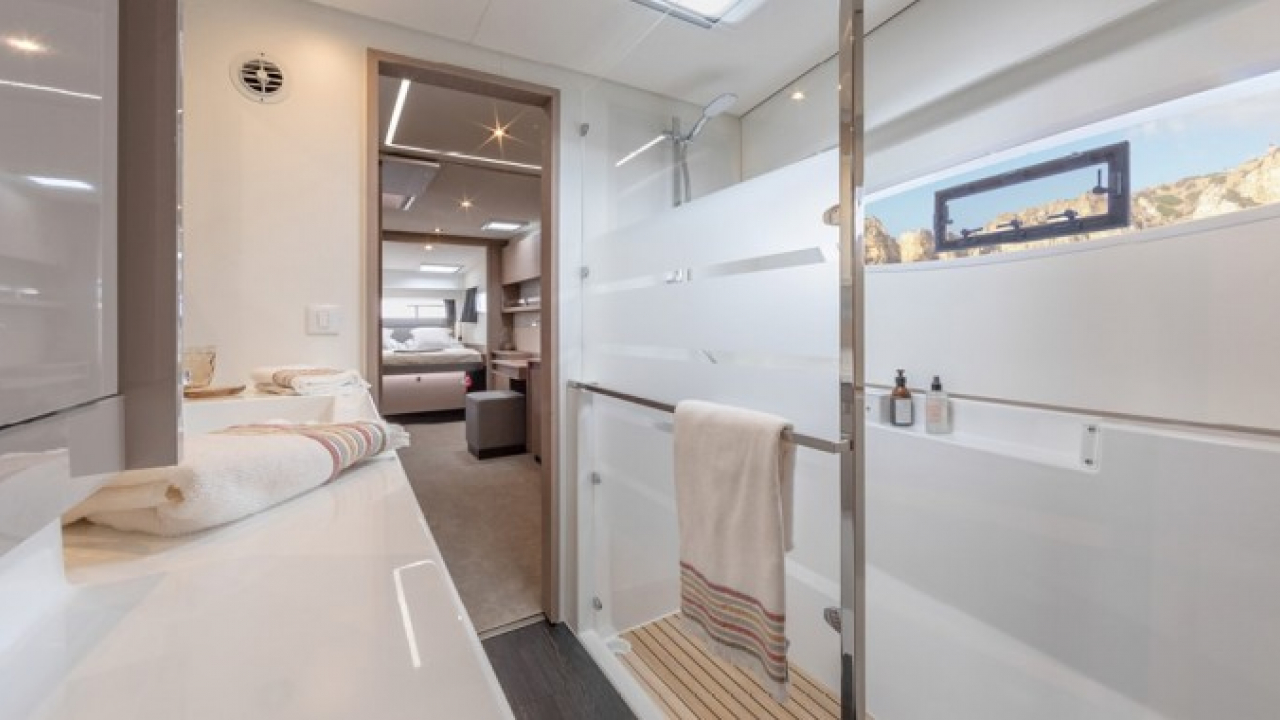 The Elba 45 is available in version Maestro, with an Owner’s suite and its ensuite bathroom, two double cabins and two adjoining bathrooms.