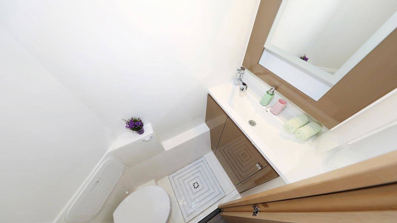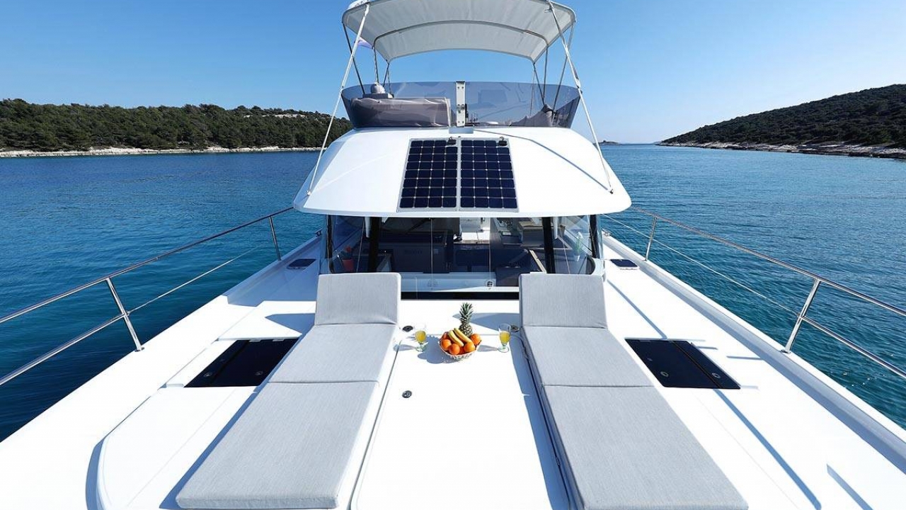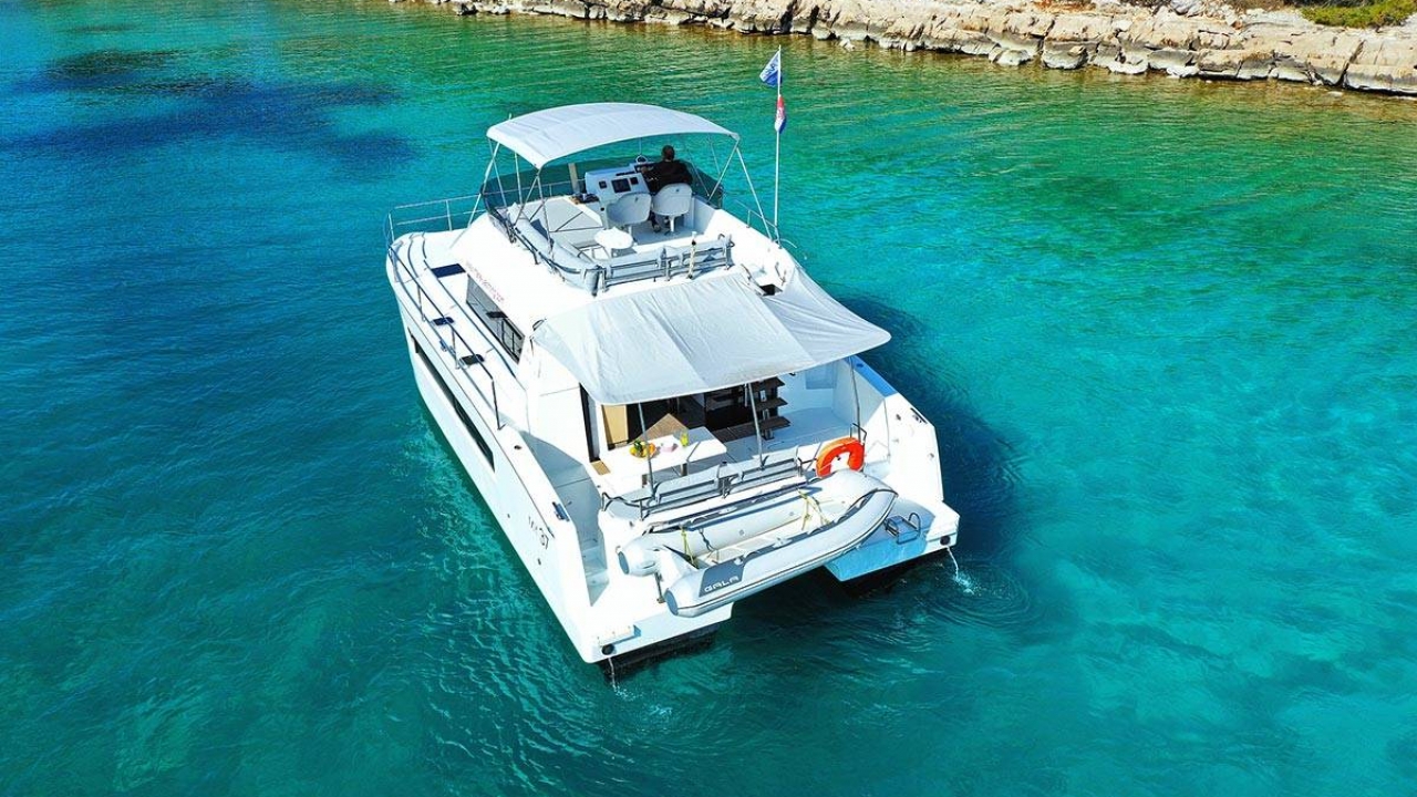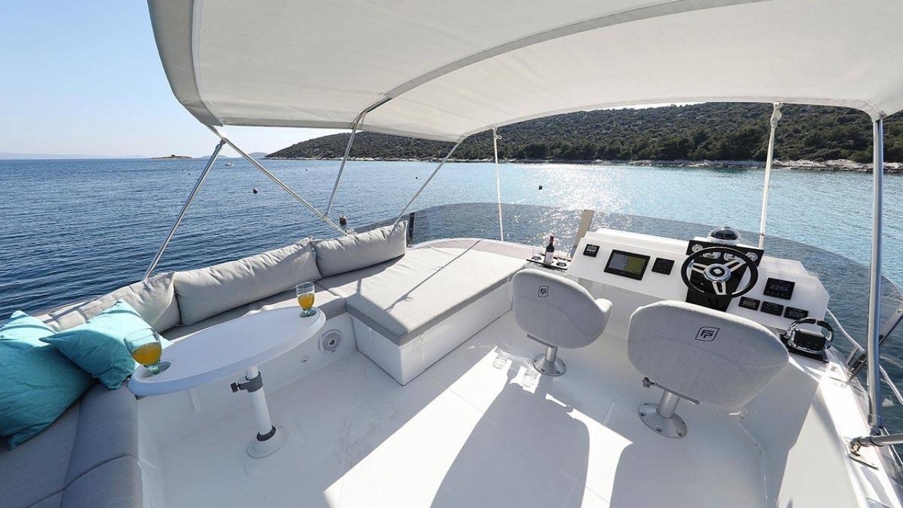 This motor catamaran is the perfect choice for a boating holiday with friends or family. The Fountaine Pajot MY 37 features modern designed cabins, a light-filled saloon with panoramic windows and integrated cockpit access, a magnificent flybridge with helm station, generous sunbathing area and a comfortable seating area with dining table. With its two engines and the electronic cruise control, Kalea can be easily manoeuvred from the flybridge as well as from the saloon.