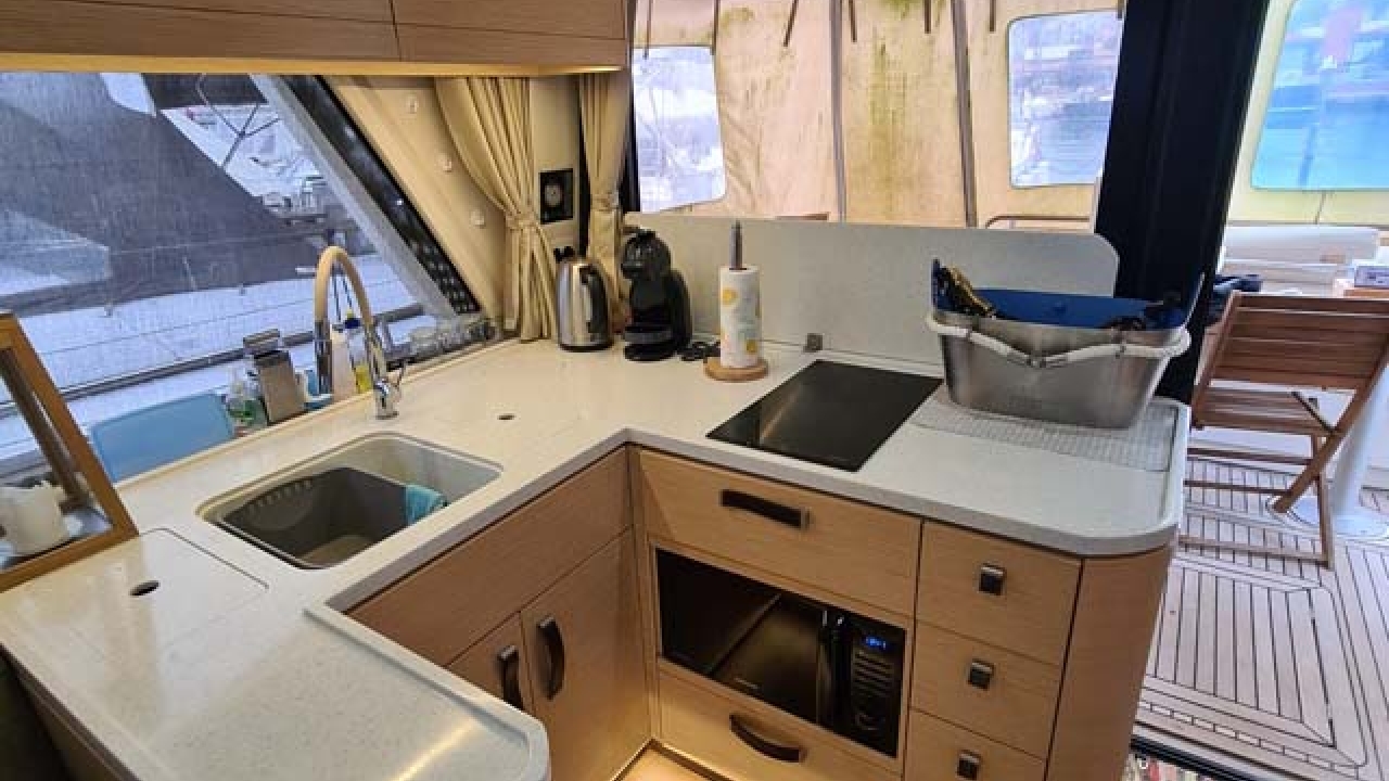 Coffee machine, Hot water, Kitchen utensils (Galley equipment, cutlery), Microwave, Refrigerator