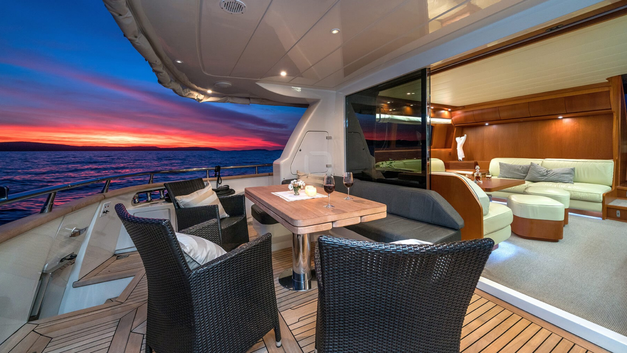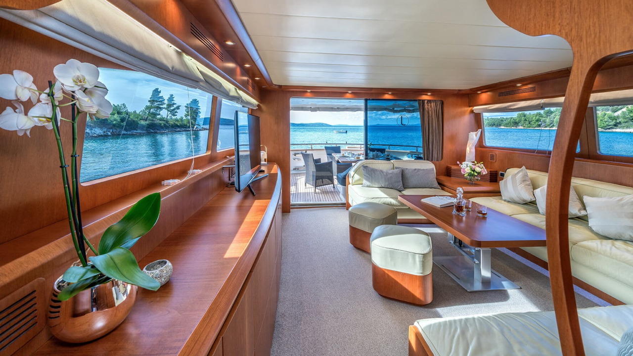 Jantar is a the perfect combination of classic, modern and sporty and her posh lines make her a true fashion impeller. Her V-shaped hull provides an adrenaline rush while cutting through the waves while the panoramic flybridge calls for the wind in your hair. Upon entering the saloon, Maiora 20 welcomes you with a home away from home environment, with remarkable attention to details and a unique feel of natural light through the wide windows. With no wall separating the dining area from the saloon, it is quite casual to communicate and interact with each other along with the entire space.