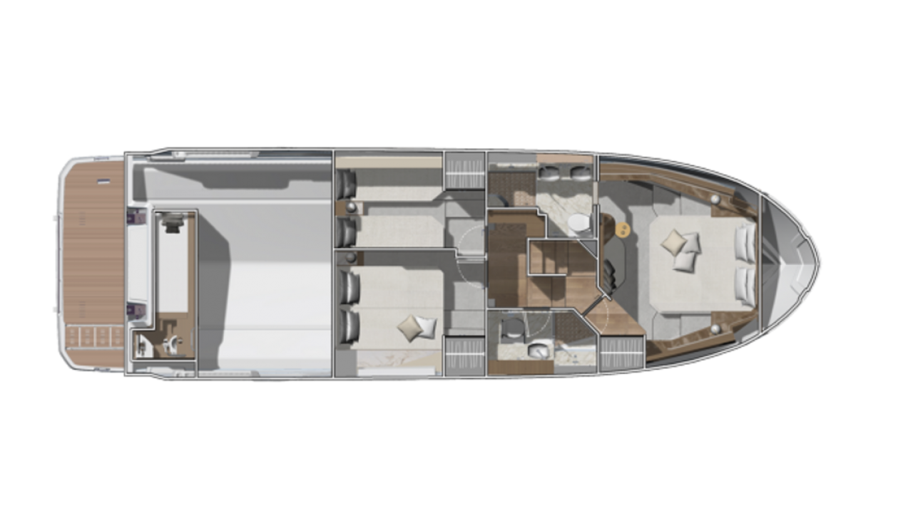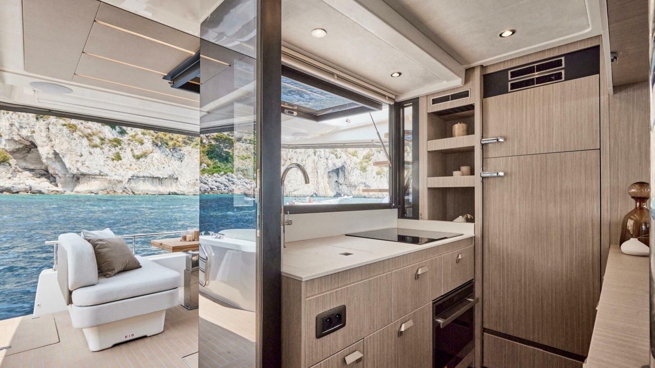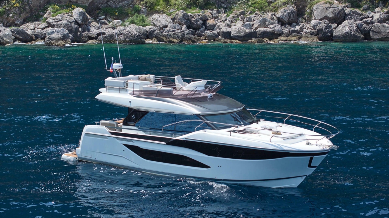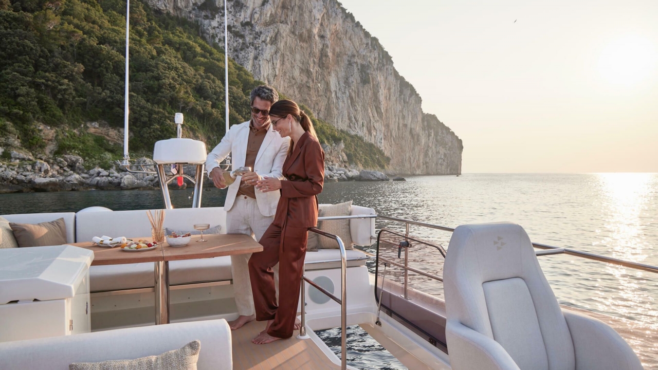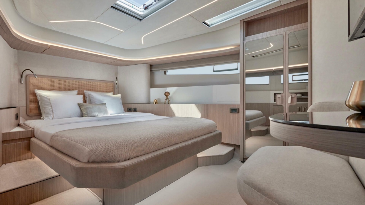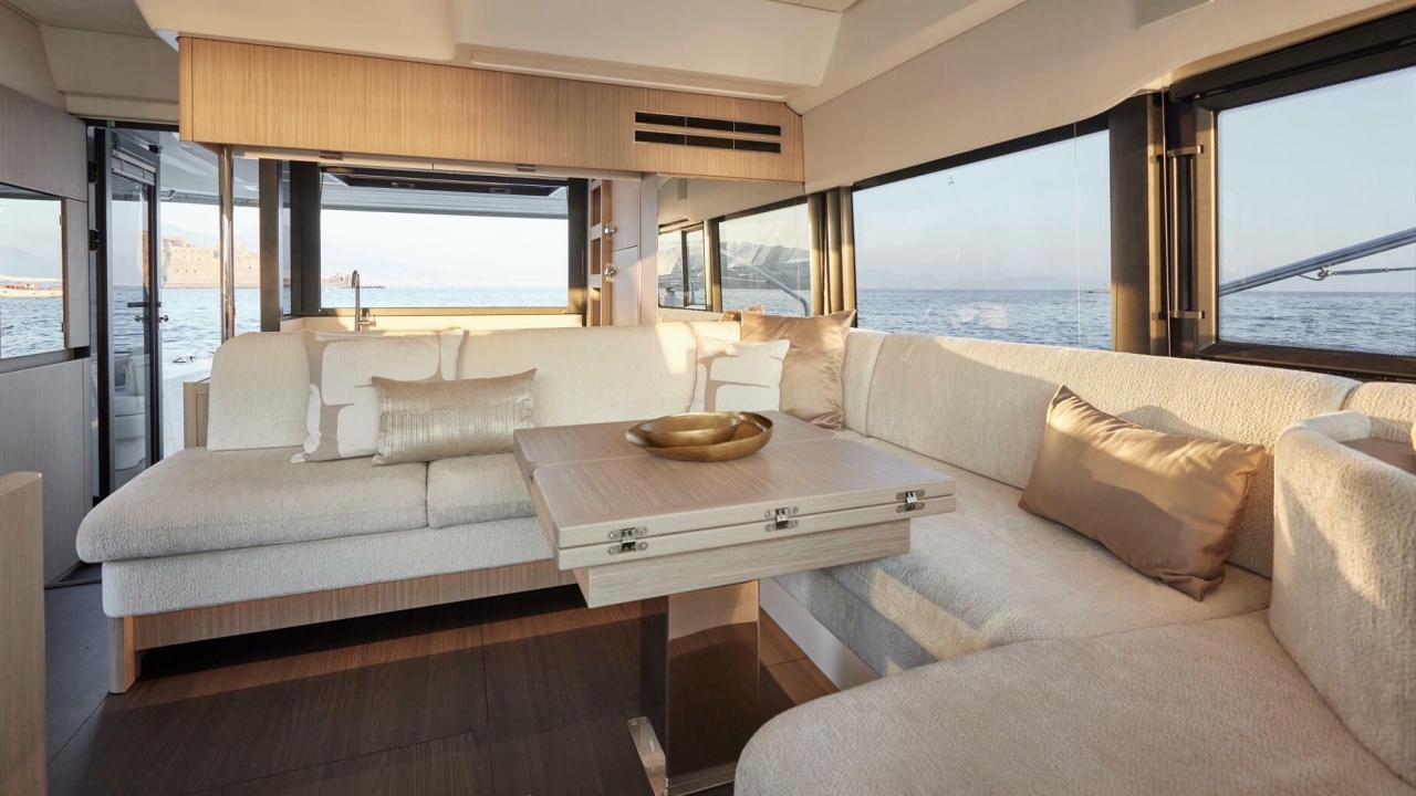 Inspired by the movement of water, the elegant, fluid exterior lines of the new hull of the F4.9 marry perfectly with the polished surfaces of living spaces, reflecting an abundance of natural light.  Curves have been meticulously studied to confer softness, refinement, and power to the whole.  The exterior and interior furnishings have been reinvented to offer exceptional comfort for all on board.