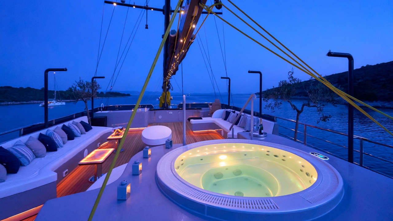 Superb sundeck with a Jacuzzi, sunbathing area with sundeck mattresses, open bar, telescope and Cinema screen