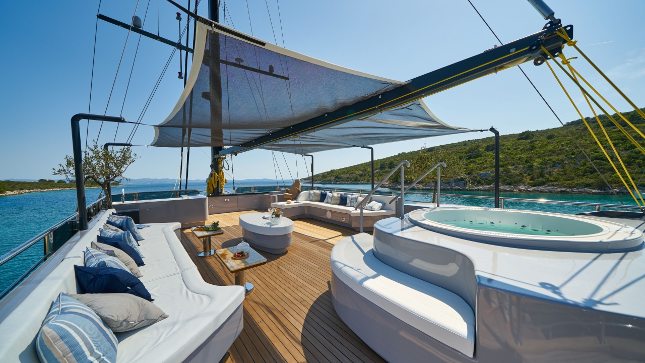 The sundeck with large Jacuzzi surrounded by cushioned area, sun mattresses, outside shower and two seating areas with coffee tables, all under a lovely shade and masts