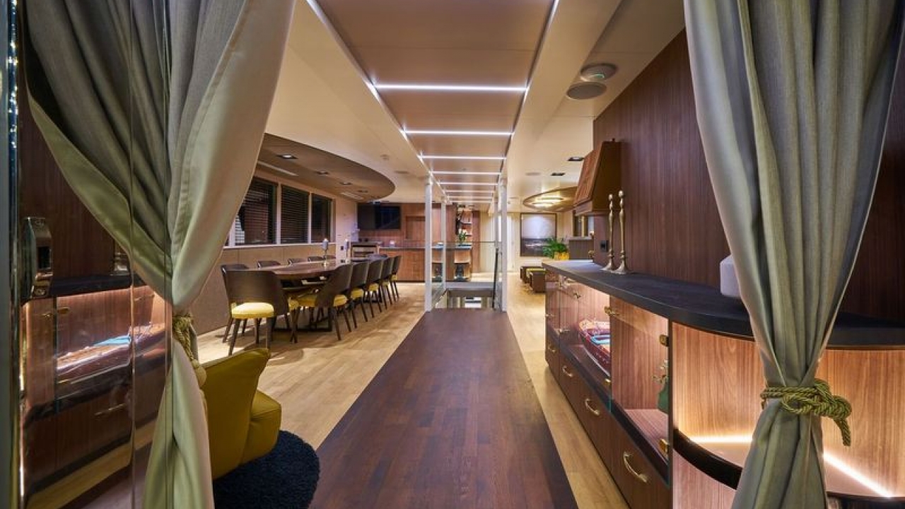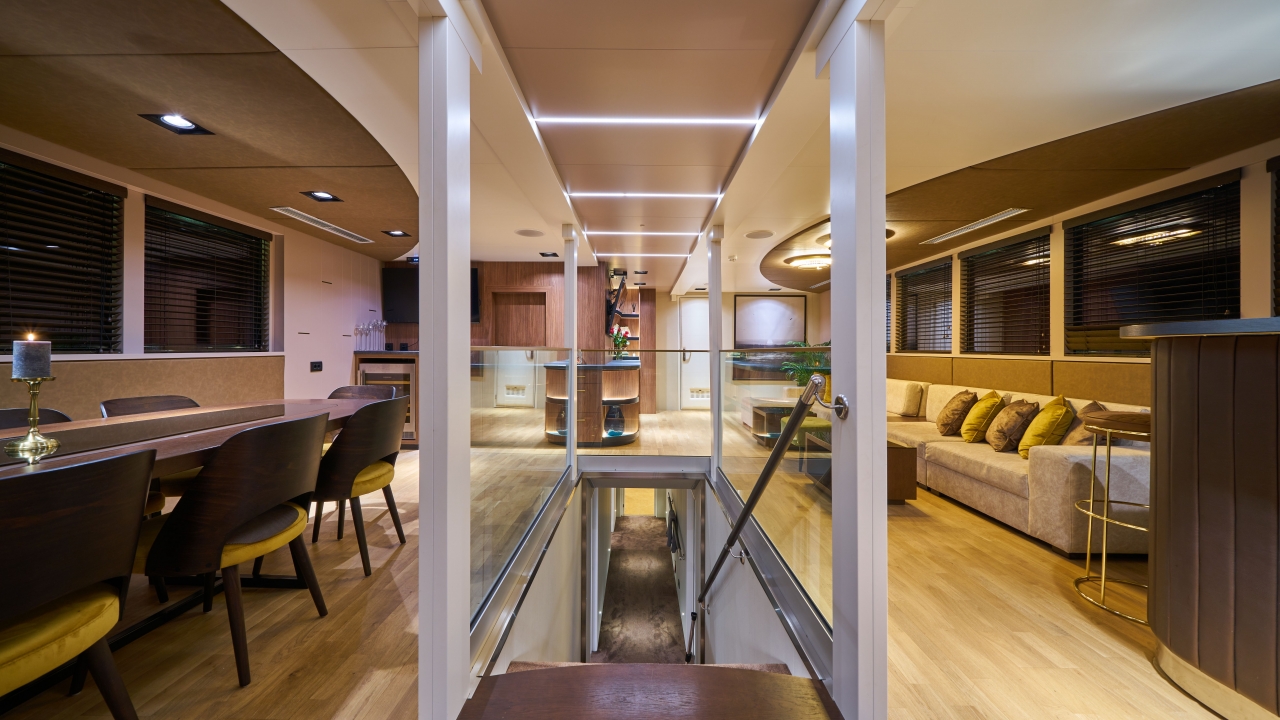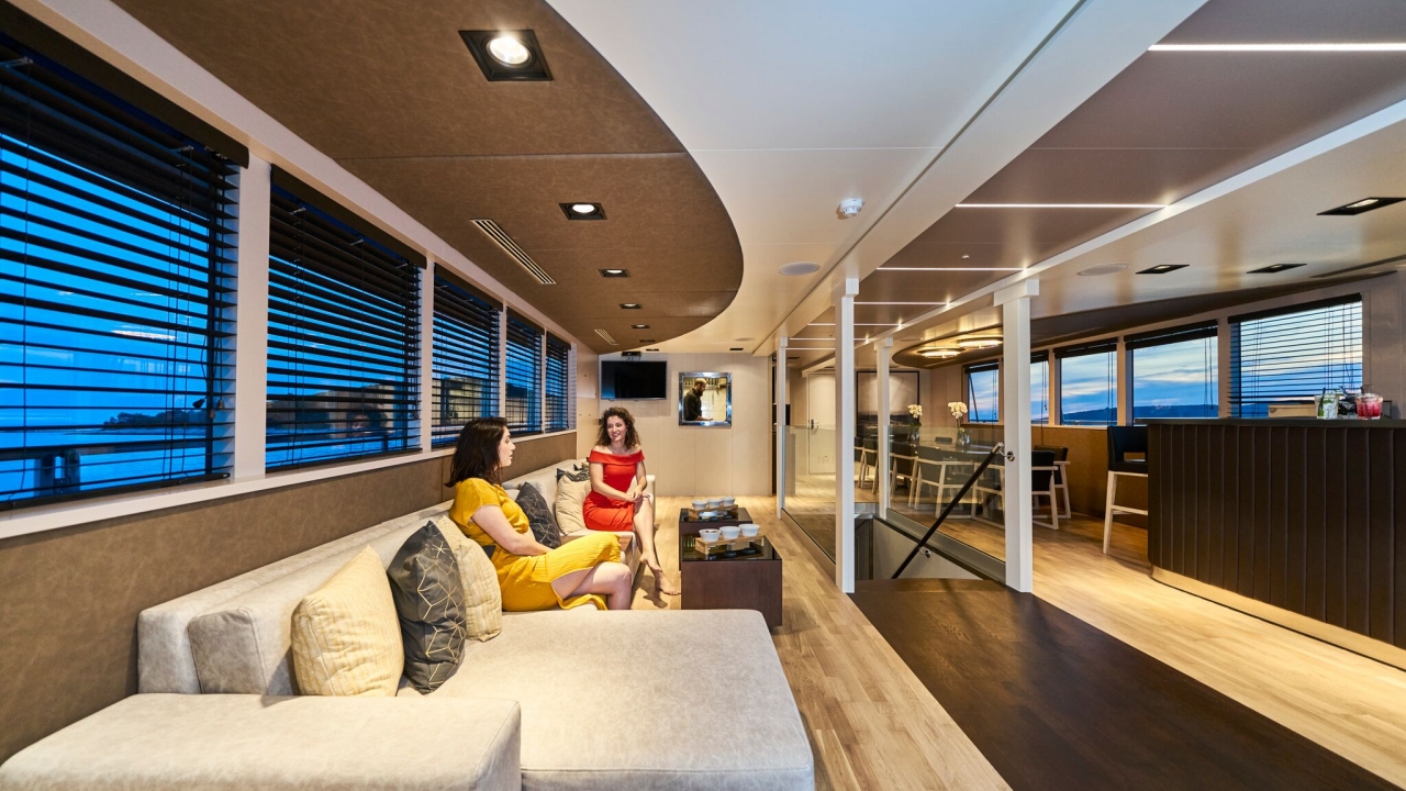 Main Saloon combines a spacious and luxury dining area with an elegant bar and lounge seating area