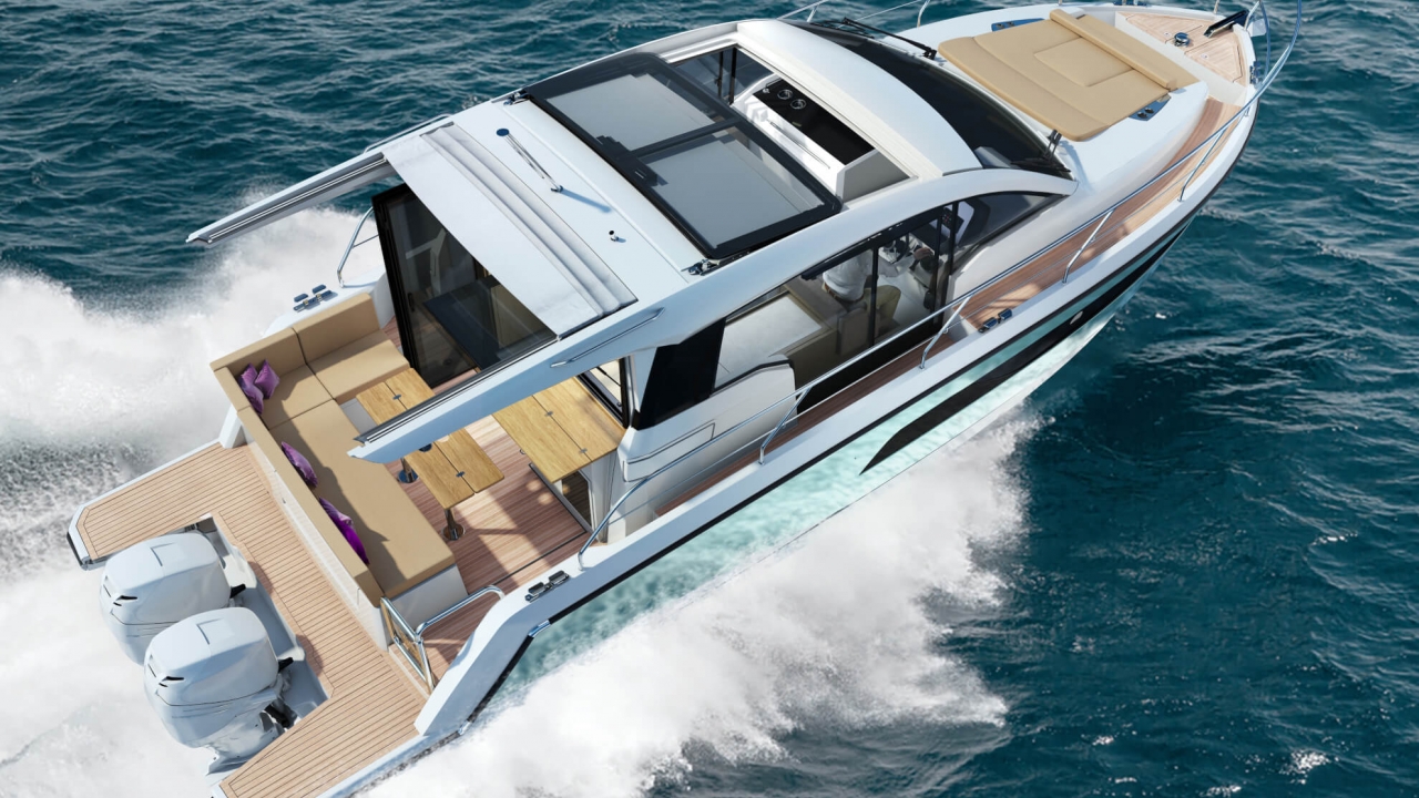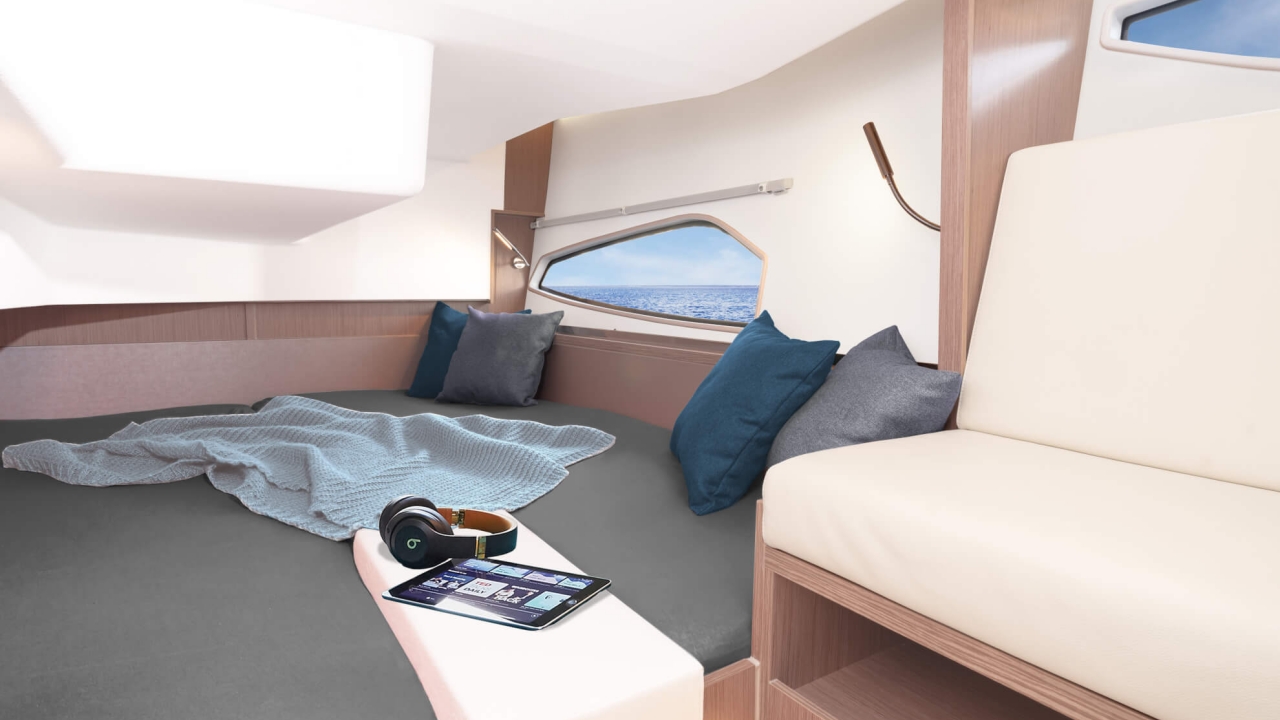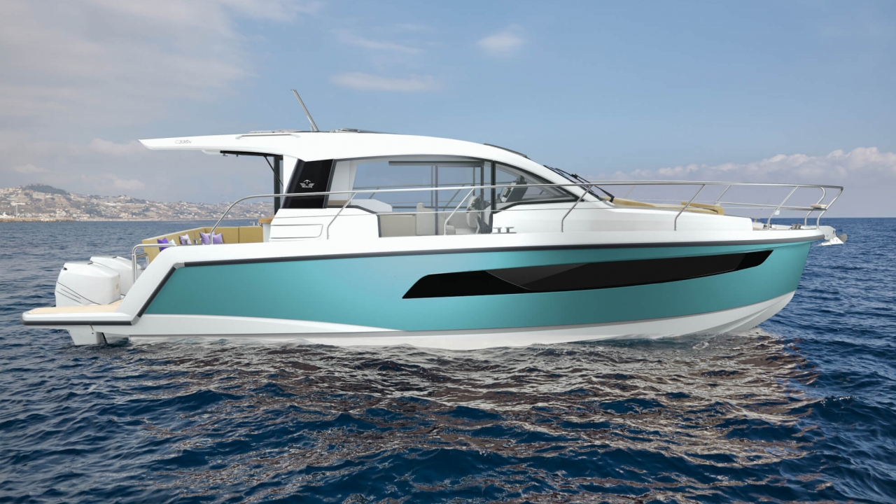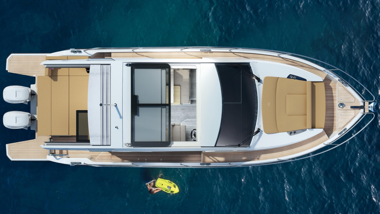 The SEALINE C335v combines the temperament of outboard propulsion with an elegantly designed lifestyle. Two 300hp motors promise furious driving pleasure, which is further enhanced by the new progressive character of the helm. From the saloon to the owner's cabin, the interior demonstrates total style, combining subtle colours and high-end materials. The exclusive lifestyle continues in the water, because there is room for water sports equipment of all sizes in the storage space under the cockpit. Experience modern aesthetics and luxurious volumes now with the SEALINE C335v.