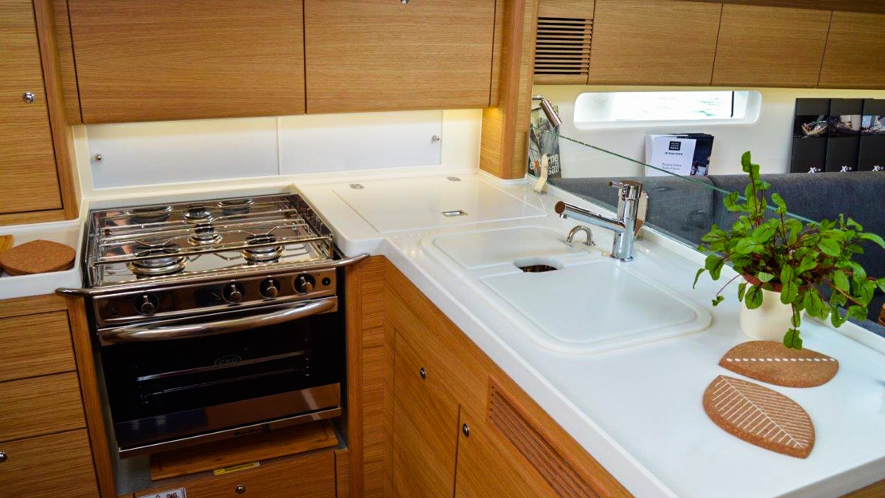 Hot water, kitchen utensils(Galley equipment, cutlery), Nespresso coffee machine, oven, refrigirator, stove